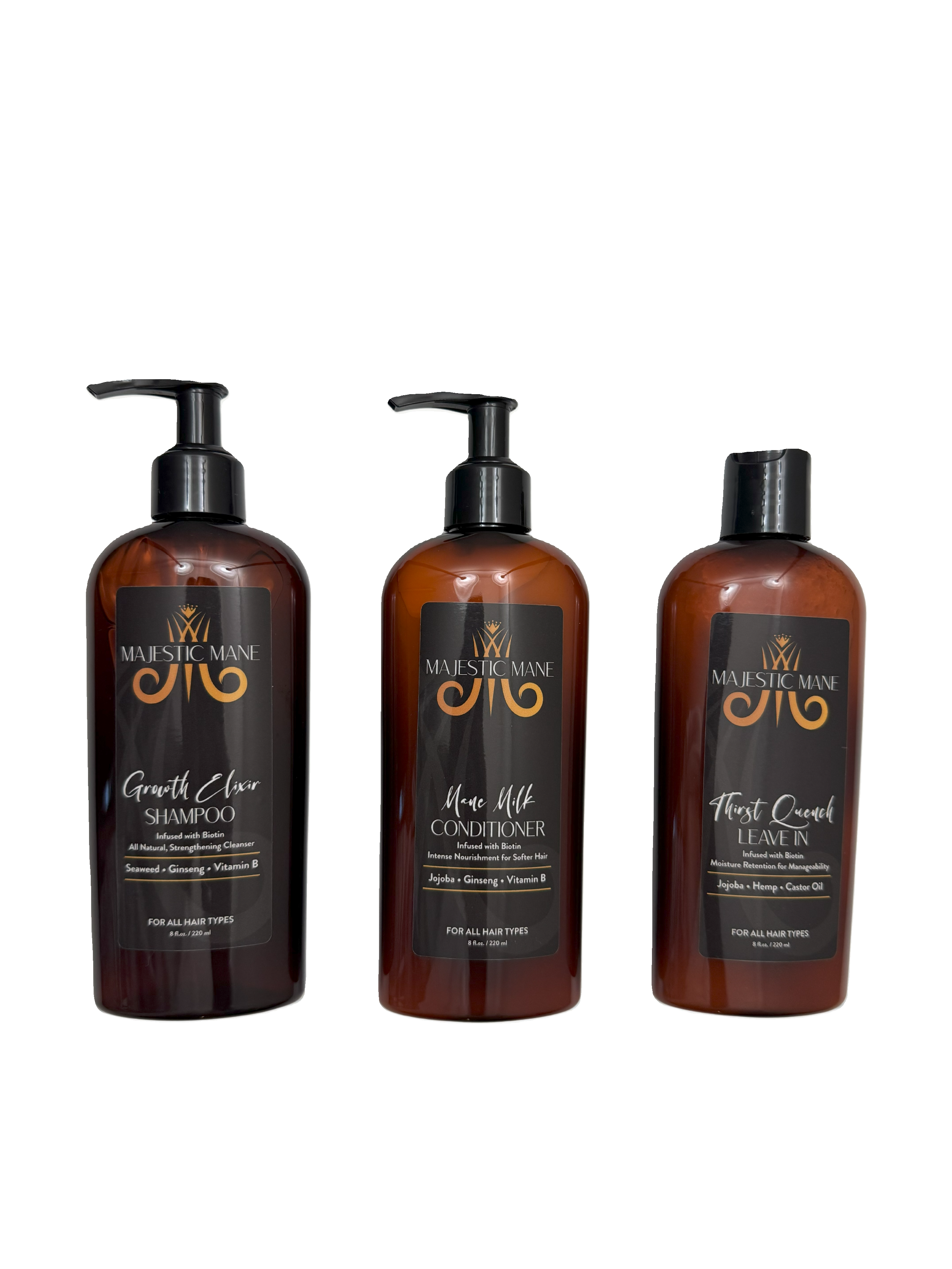 The Majestic Mane Essential Hair Recovery System is a four-step restorative regimen engineered for foundational hair repair and optimal moisture equilibrium. By combining advanced botanical extracts with scalp-cleansing agents, protein-rich conditioners, and intensive strand-repair treatments, these organic wavy hair products are designed to reverse signs of damage, enhance follicular function, restore natural elasticity, and treat hair loss. Ideal for individuals grappling with excessive dryness, brittleness, and weakened hair shafts, indeed the best products for healthy hair, this regimen reflects a holistic philosophy—treating hair as both a living fibre and a biological extension of scalp health.
